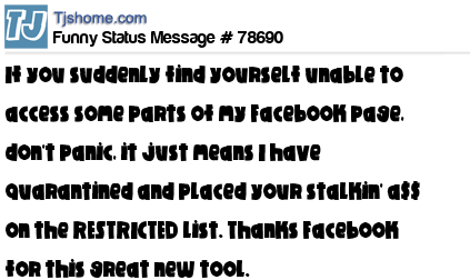 X says If you suddenly find yourself unable to access some parts of my Facebook page, don't panic, it just means I have quarantined and placed your stalkin' a$$ on the RESTRICTED list. Thanks Facebook for this great new tool.