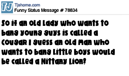 X says so if an old lady who wants to bang young guys is called a Cougar I guess an old man who wants to bang little boys would be called a Nittany Lion?