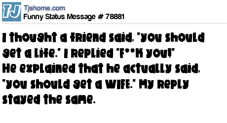 X I thought a friend said, "you should get a life." I replied "F**k you!" He explained that he actually said, "you should get a WIFE." My reply stayed the same.