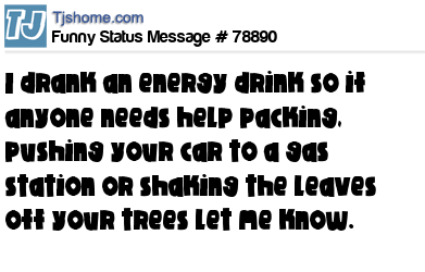 X  I drank an energy drink so if anyone needs help packing, pushing your car to a gas station or shaking the leaves off your trees let me know.