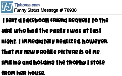 X is I sent a Facebook friend request to the girl who had the party I was at last night. I immediately realized, however, that my new profile picture is of me, smiling and holding the trophy I stole from her house.