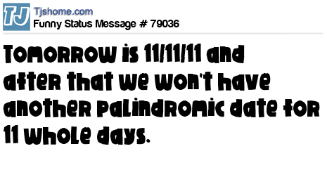 X Tomorrow is 11/11/11 and after that we won't have another palindromic date for 11 whole days.