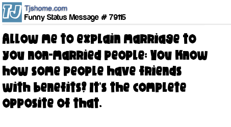 X Allow me to explain marriage to you non-married people: You know how some people have friends with benefits? It's the complete opposite of that.