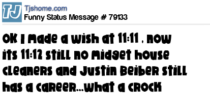 X OK I made a wish at 11:11 , now its 11:12 still no midget house cleaners and Justin Beiber still has a career...what a crock