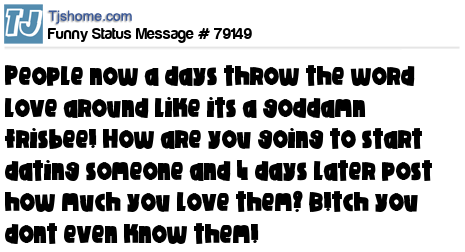 X is People now a days throw the word love around like its a goddamn frisbee! How are you going to start dating someone and 4 days later post how much you love them? B!tch you dont even know them!