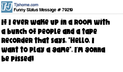 - # 54373 If I ever wake up in a room with a bunch of people and a tape recorder that says, "Hello, I want to play a game", I'm gonna be pissed!!!