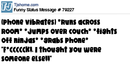 - # 40658 (phone vibrates) *runs across room* *jumps over couch* *fights off ninja* *grabs phone* "damn, I thought you were some else!"
