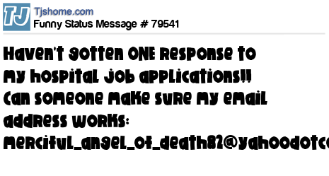 X  Haven't gotten ONE response to my hospital job applications!! Can someone make sure my email address works: merciful_angel_of_death82@yahoodotcom