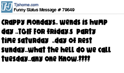 X Crappy mondays,, wends is hump day ..TGIF For friday,s party time saturday ,,day of rest sunday..what the hell do we call tuesday..any one know.????