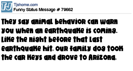 - # 80013 They say animal behavior can warn you when an earthquake is coming. Like the night before that last earthquake hit, our dog took the car keys and drove to Arizona.