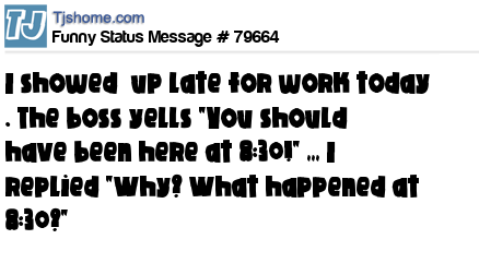 X I showed up late for work today . The boss yells "You should have been here at 8:30!" ,,, I replied "Why? What happened at 8:30?"