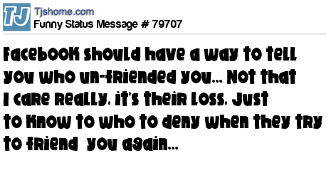 X is Facebook should have a way to tell you who un-friended you... Not that I care really, it's their loss, Just to know to who to deny when they try to friend you again...