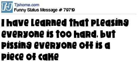 - # 67678 I have learned that pleasing everyone is too hard, but pissing everyone off is a piece of cake and I like it :-)