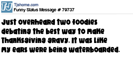 X Just overheard two foodies debating the best way to make Thanksgiving gravy. It was like my ears were being waterboarded.