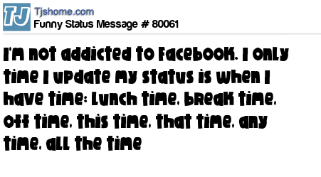 - # 70145 I'm not addicted to Facebook. I only tweet when I have time: lunch time, break time, off time, this time, that time, any time, all the time.