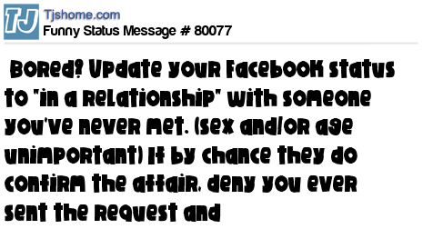 - # 37599 Bored? Update your Facebook to "in a relationship" with someone you've never met just to see if they'll confirm.