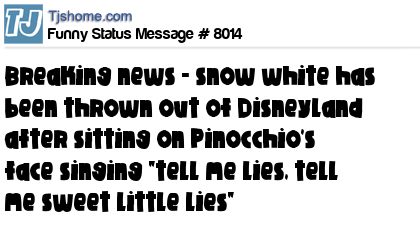 X Breaking news - snow white has been thrown out of Disneyland after sitting on Pinocchio's face singing "tell me lies, tell me sweet little lies"