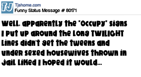 X is well, apparently the "Occupy" signs I put up around the long TWILIGHT lines didn't get the tweens and under sexed housewives thrown in jail liked I hoped it would...
