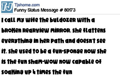 X i call my wife the buldozer with a broken rearview mirror. she flattens everything in her path and doesn't see it. she used to be a fun-sponge now she is the fun sham-wow now capable of soaking up 4 times the fun