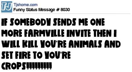 - # 27329 if someone sends me one more Farmville invite, I will banish your animals to a galaxy far, far away and set fire to your crops.