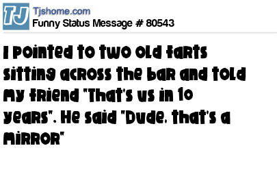 X says I pointed to two old farts sitting across the bar and told my friend "That's us in 10 years". He said "Dude, that's a mirror"