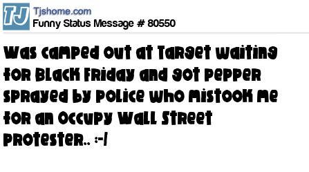 X was camped out at Target waiting for Black Friday and got pepper sprayed by police who mistook me for an Occupy Wall Street protester.. :-/
