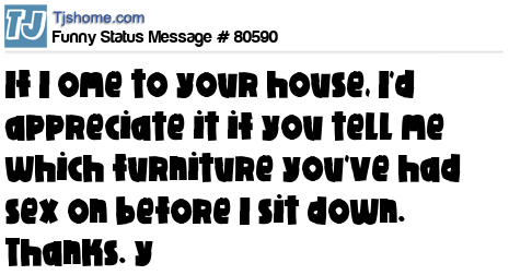 X If I ome to your house, I'd appreciate it if you tell me which furniture you've had sex on before I sit down. Thanks. y