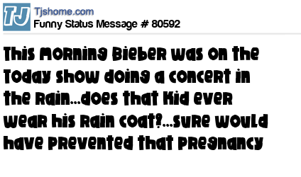X says this morning Bieber was on the Today show doing a concert in the rain...does that kid ever wear his rain coat?...sure would have prevented that pregnancy