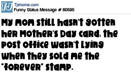 X says My mom still hasn't gotten her Mother's Day card, the post office wasn't lying when they sold me the "forever" stamp.