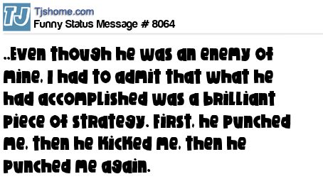 X ..Even though he was an enemy of mine, I had to admit that what he had accomplished was a brilliant piece of strategy. First, he punched me, then he kicked me, then he punched me again.