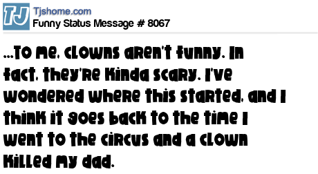 - # 206670 To me, clowns aren't funny. In fact, they're kind of scary. I've wondered where this started, and I think it goes back to the time I went to the circus, and a clown killed my dad.