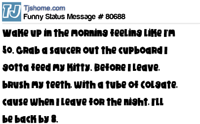 X Wake up in the morning feeling like I'm 50. Grab a saucer out the cupboard I gotta feed my kitty. Before I leave, brush my teeth, with a tube of Colgate, cause when I leave for the night, I'll be back by 8.