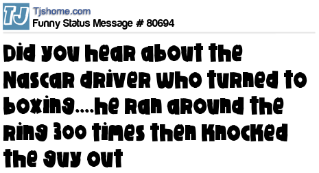 X is Did you hear about the Nascar driver who turned to boxing....he ran around the ring 300 times then knocked the guy out