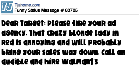 X says Dear Target: please fire your ad agency. That crazy blonde lady in red is annoying and will probably bring your sales way down. Call an audible and hire Walmart's
