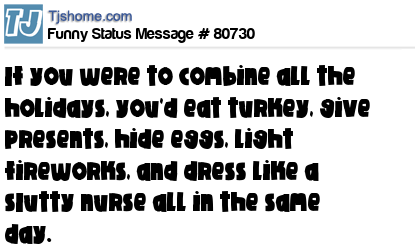 X is If you were to combine all the holidays, you'd eat turkey, give presents, hide eggs, light fireworks, and dress like a sIutty nurse all in the same day.