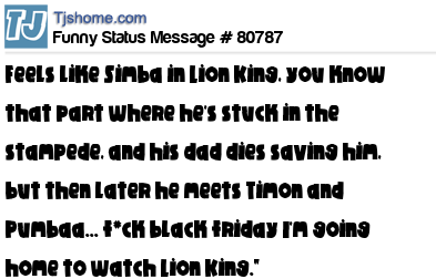 X feels like Simba in Lion King, you know that part where he's stuck in the stampede, and his dad dies saving him, but then later he meets Timon and Pumbaa... f*ck black friday I'm going home to watch Lion King."
