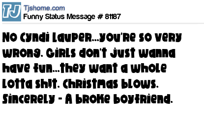 X No Cyndi Lauper...you're so very wrong. Girls don't just wanna have fun...they want a whole lotta sh!t. Christmas blows. Sincerely - A broke boyfriend.