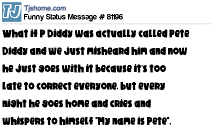 X What if P Diddy was actually called Pete Diddy and we just misheard him and now he just goes with it because it's too late to correct everyone, but every night he goes home and cries and whispers to himself "My name is Pete".