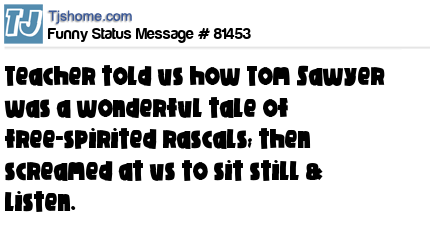 - # 97584 Teacher told us how Tom Sawyer was a free-spirited tale of misbehaving rascals; then screamed at us to sit still & listen.