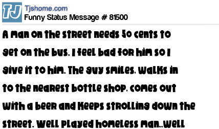 X A man on the street needs 50 cents to get on the bus. I feel bad for him so I give it to him. The guy smiles, walks in to the nearest bottle shop, comes out with a beer and keeps strolling down the street. Well played homeless man..well played.