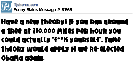 X have a new theory! If you ran around a tree at 270,000 miles per hour you could actually "f**k yourself". Same theory would apply if we re-elected Obama again.
