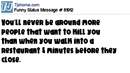 X says You'll never be around more people that want to kill you than when you walk into a restaurant 5 minutes before they close.