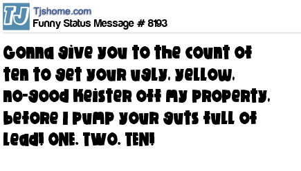 - # 11378 I'm gonna give you to the count of 10 to get your get your ugly yellow no good kester off my property, before I pump your gust full of led 1....2.... 10