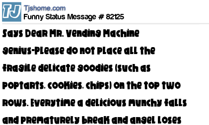 X is says Dear Mr. Vending Machine genius-Please do not place all the fragile delicate goodies (such as poptarts, cookies, chips) on the top two rows. Everytime a delicious munchy falls and prematurely break and angel loses its wings :'(