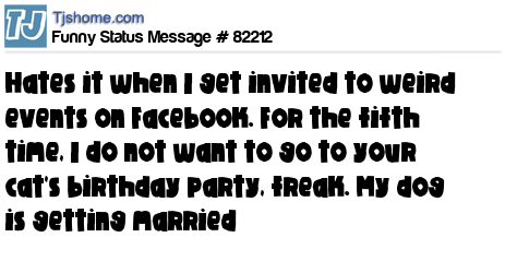 - # 160691 hates it when I get invited to weird events on Facebook. For the fifth time, I do not want to go to your cat's birthday party, FREAK!...My dog is getting married