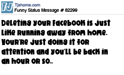 - # 94860 Deleting your facebook is like running away from home. `You`re just doing it for attention and you'll be back in an hour`.