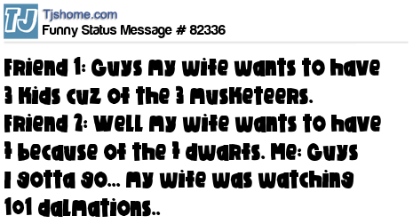 X Friend 1: Guys my wife wants to have 3 kids cuz of the 3 musketeers. Friend 2: Well my wife wants to have 7 because of the 7 dwarfs. Me: Guys I gotta go... my wife was watching 101 dalmations..