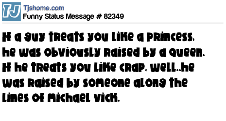 X If a guy treats you like a princess, he was obviously raised by a queen. If he treats you like crap, well..he was raised by someone along the lines of michael vick.