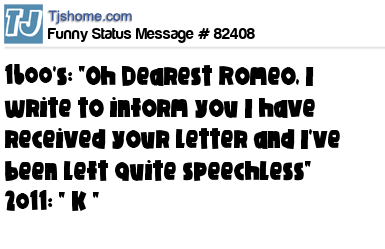 X 1600's: "Oh Dearest Romeo, I write to inform you I have received your letter and I've been left quite speechless" 2011: " K "