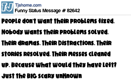X People don't want their problems fixed. Nobody wants their problems solved. Their dramas. Their Distractions. Their stories resolved. Their messes cleaned up. Because what would they have left? Just the BIG scary unknown